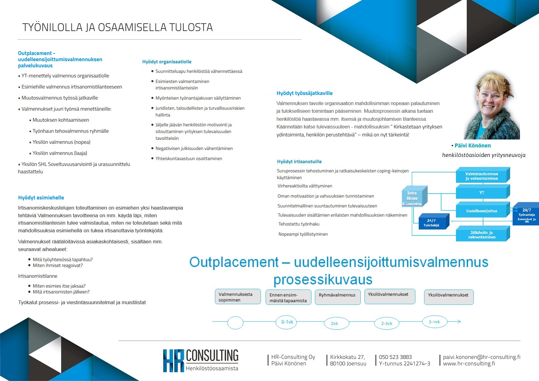 Valmennuksen tavoitteena on organisaation mahdollisimman nopea palautuminen ja tulokselliseen toimintaan pääseminen. Muutosprosessin aikana tuetaan henkilöstöä haastavassa mm. itsensä- ja muutosjohtamisen tilanteessa. Käännetään katse tulevaissuuteen - mahdollisuuksiin!